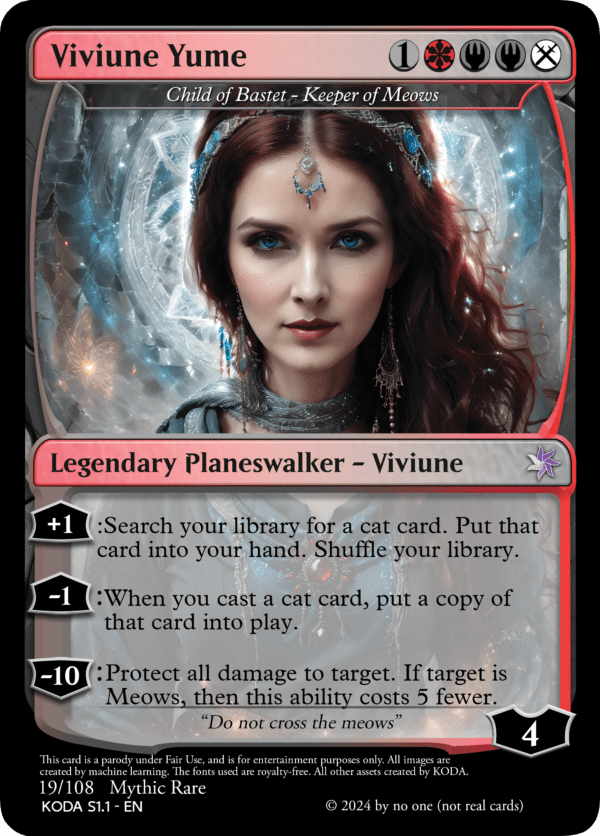 Card Text: +1 Search your library for a cat card. Put that card into your hand. Shuffle your library. -1 When you cast a cat card, put a copy of that card into play. -10 Protect all damage to target. If target is Meows, then this ability costs 5 fewer.